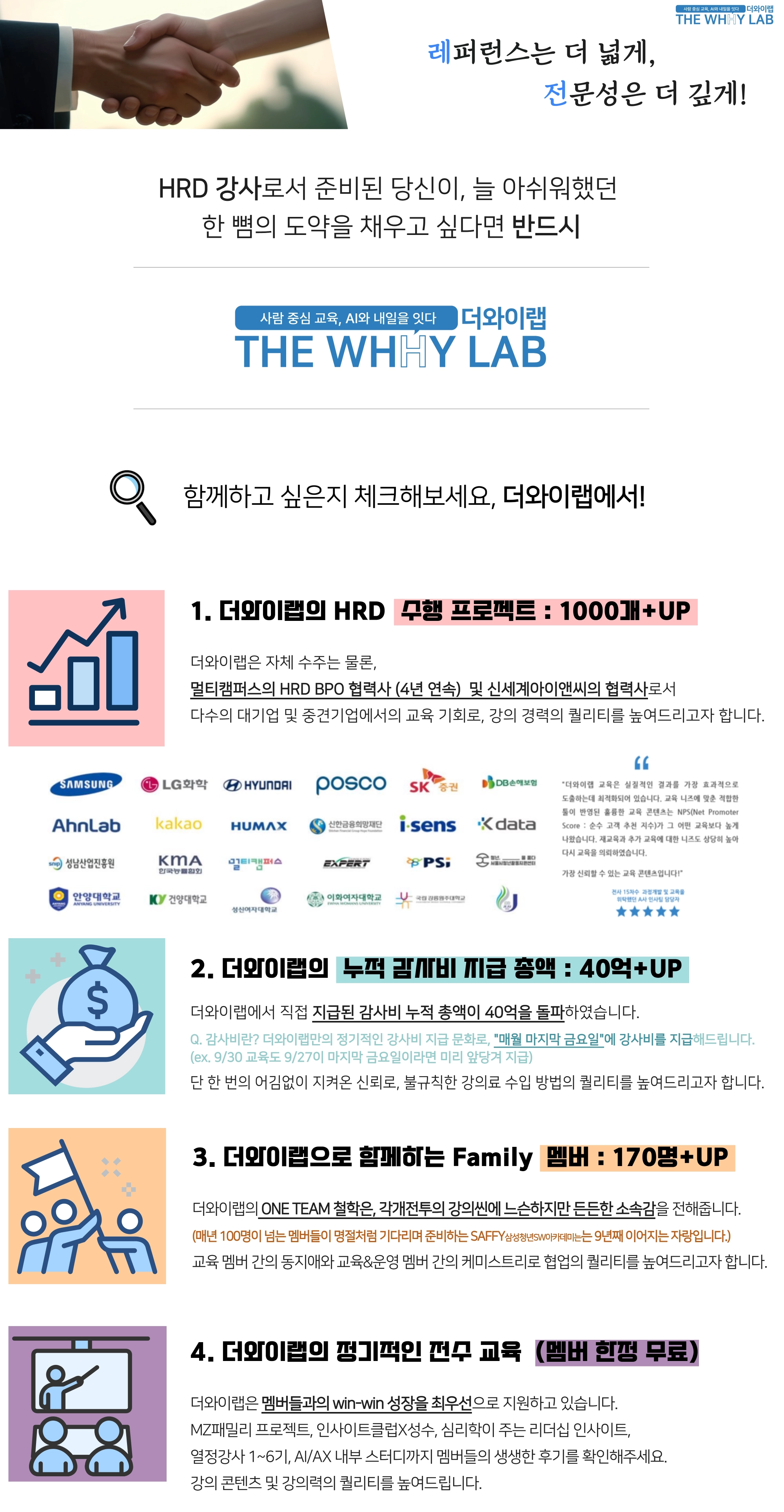 [한국강사신문 정명훈 기자] ㈜더와이랩의 교육의뢰플랫폼 씨스타트는 의뢰받은 교육 프로젝트를 수행할 교육파트너와 강사파트너를 상시 모집 중이라고 밝혔다.교육의뢰플랫폼 씨스타트는 클라이언트와 교육파트너 사이의 매칭을 도와주는 플랫폼으로, 기업 또는 기관이 원하는 교육에 따라 AI가 자동으로 ‘교육의뢰서’를 작성해 주는 서비스를 제공하고 있다. 또한 씨스타트 플랫폼은 클라이언트가 원하는 교육 프로그램과 교육기업 및 강사 파트너를 손쉽게 찾을 수 있도록 지원하고 있다.이를 통해 대기업과 공공기관, 대학뿐만 아니라 최근에는 AI, 스타트업,